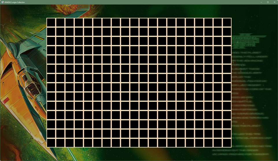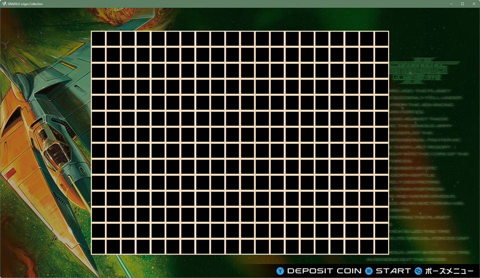結果…実は初代グラディウスと同じピクセルクロックなので、ピクセルアスペクト比も全く一緒です。テストグリッド表示も一緒で、ドットバイドットがメーカー推奨だと考えられます。